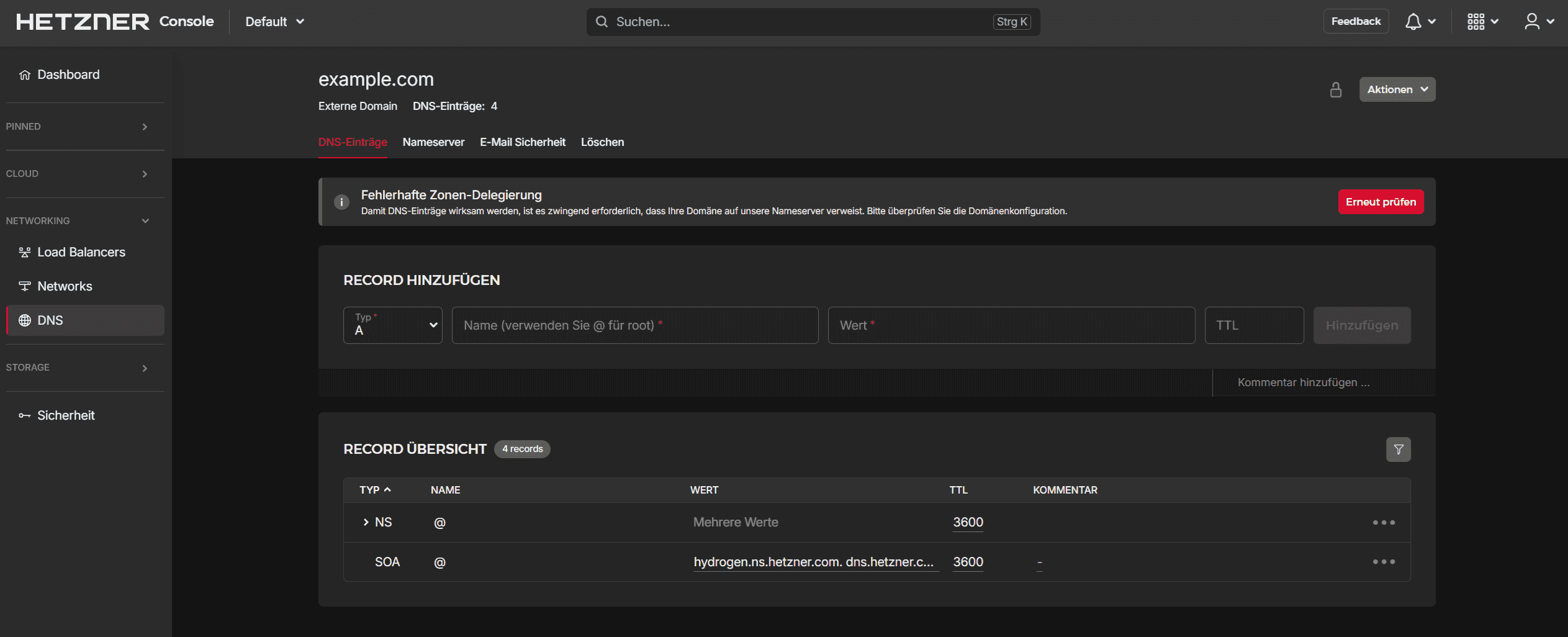 In diesem Schritt wird in der Hetzner Console eine DNS Zone für die Domain example.com angelegt. Diese wird später vom Load Balancer verwendet, um die _acme-challenge zu verarbeiten.