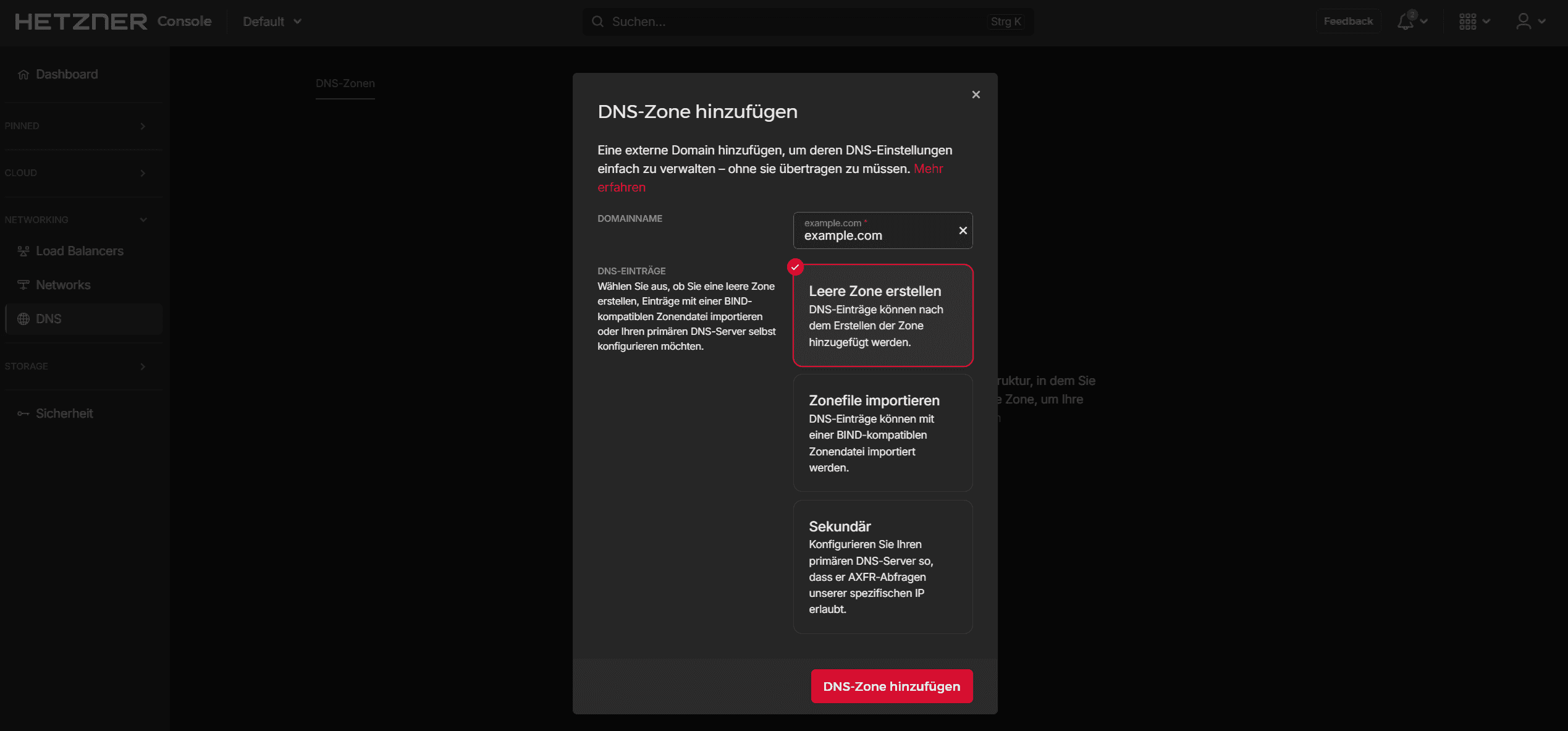 Schritt 1 - Anlegen der Hetzner DNS Zone