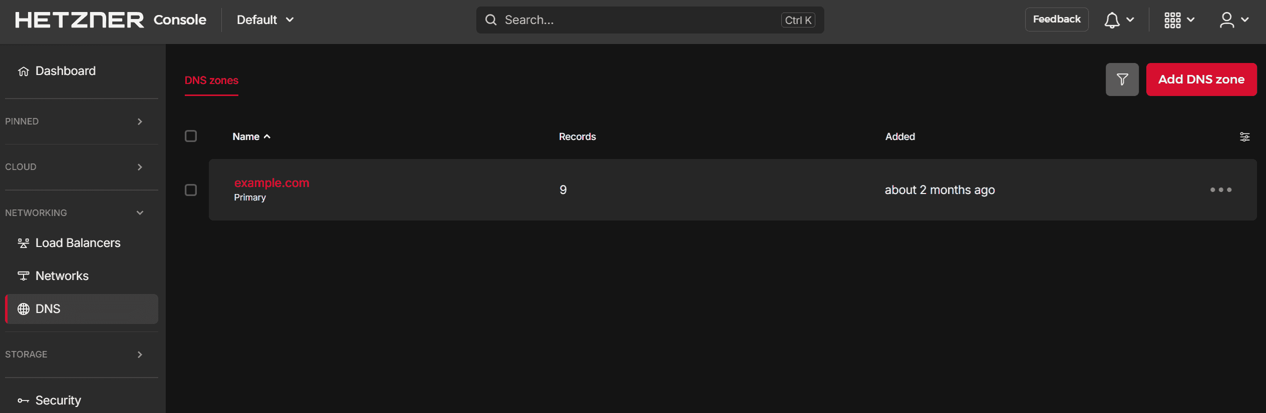 While this is taking effect, go back to the Hetzner Console and navigate to your DNS zone. Your records will probably be empty.