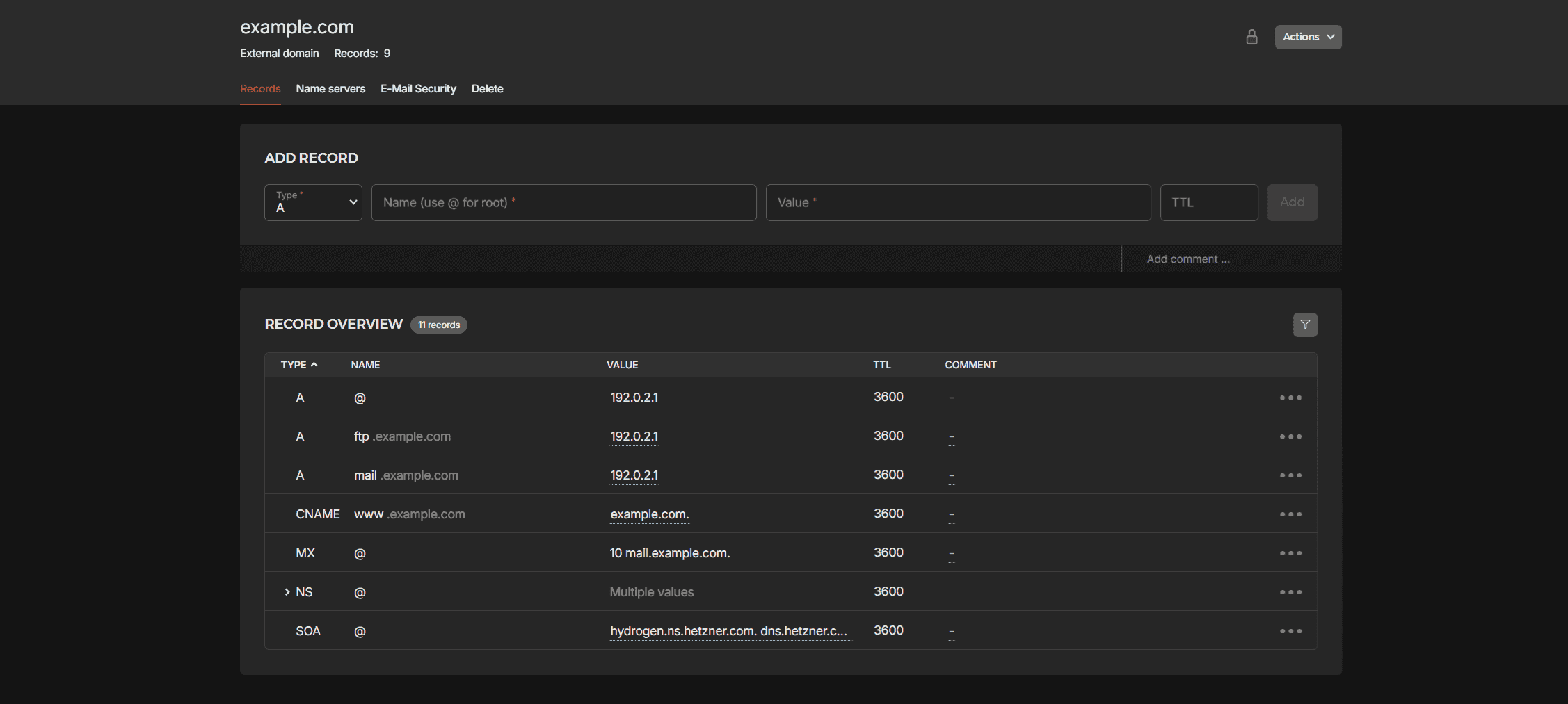 | A records | In the "Add Record" section of the site, choose A record and set the name to @ (root). Value should be your IPv4 of your VPS. Leave the TTL on default. This is the setting which affects how quickly will DNS changes take effect, however changing it now will not do anything, you would have to do it few hours before making the change. After adding the first A record, add ftp.<your-domain> and mail.<your-domain>. What A records do, as you read in the Hetzner guide is connect your domain name to your IPv4. Whenever you write your domain name, for example example.com, it will get translated to your IPv4, but your browser will still show the domain name. |