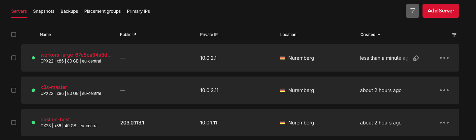 Product IP range Name Network Zone / Location Network 10.0.0.0/8 k3s-network eu-central Subnet (Public) 10.0.1.0/24 eu-central Subnet (Private) 10.0.2.0/24 eu-central Server (Bastion) 10.0.1.11 bastion-host nbg1 Server (Master) 10.0.2.11 k3s-master nbg1