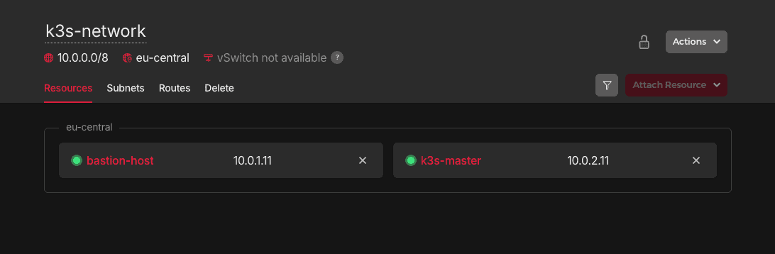 hcloud server attach-to-network k3s-master --network k3s-network --ip 10.0.2.11Step 1.3 - Configure Routes and Servers