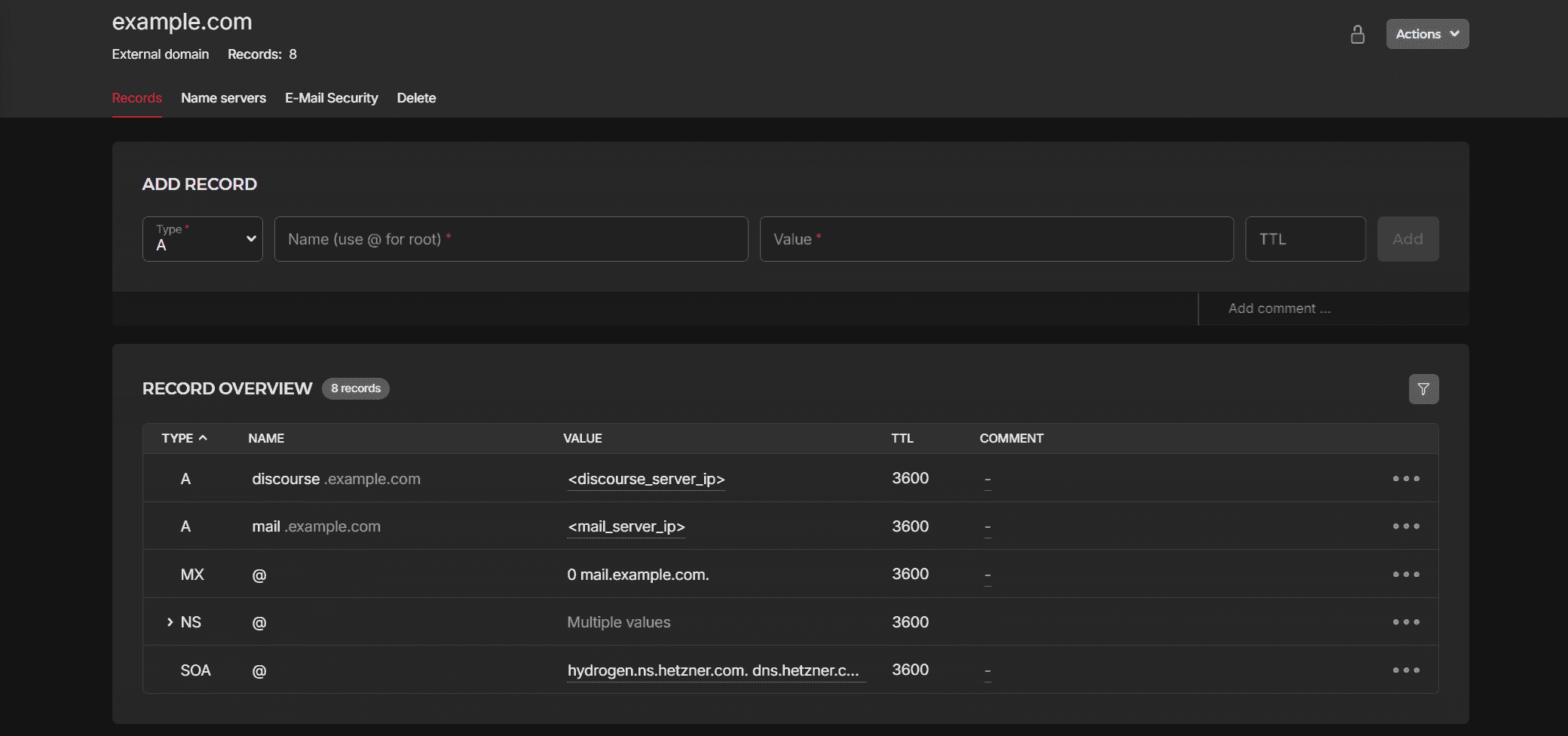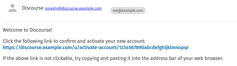 In the example below, it is assumed, that you have the domain discourse.example.com, your personal email account me@example.com and a generic email account discourse@example.com that is used by Discourse to authenticate against your mail server.