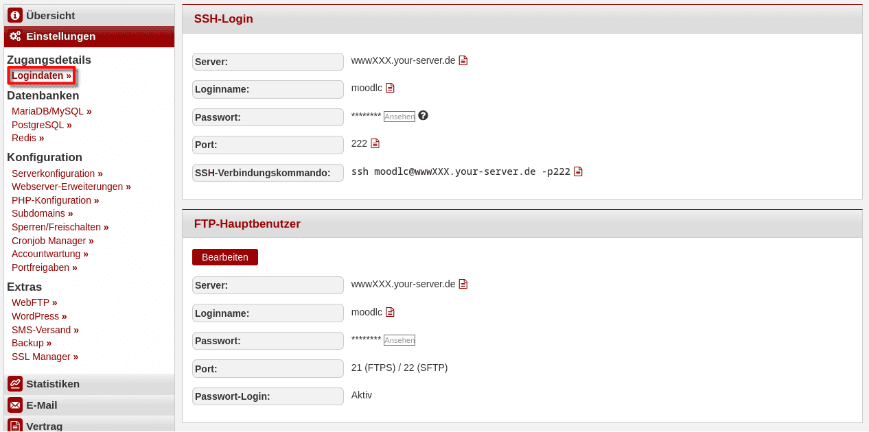 Um Moodle herunterzuladen kann man entweder eine SSH- oder eine FTP-Verbindung verwenden. Die Zugangsdaten können in konsoleH unter Zugangsdetails