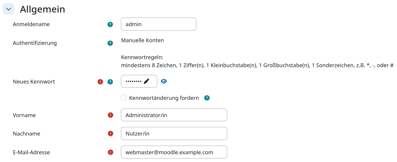- Geben Sie anschließend die Informationen für den neuen Admin-Login für Moodle ein.