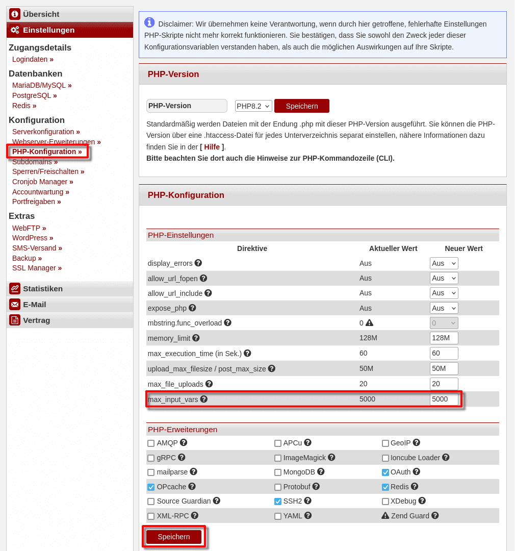 aus - Unter "PHP-Einstellungen", stellen Sie