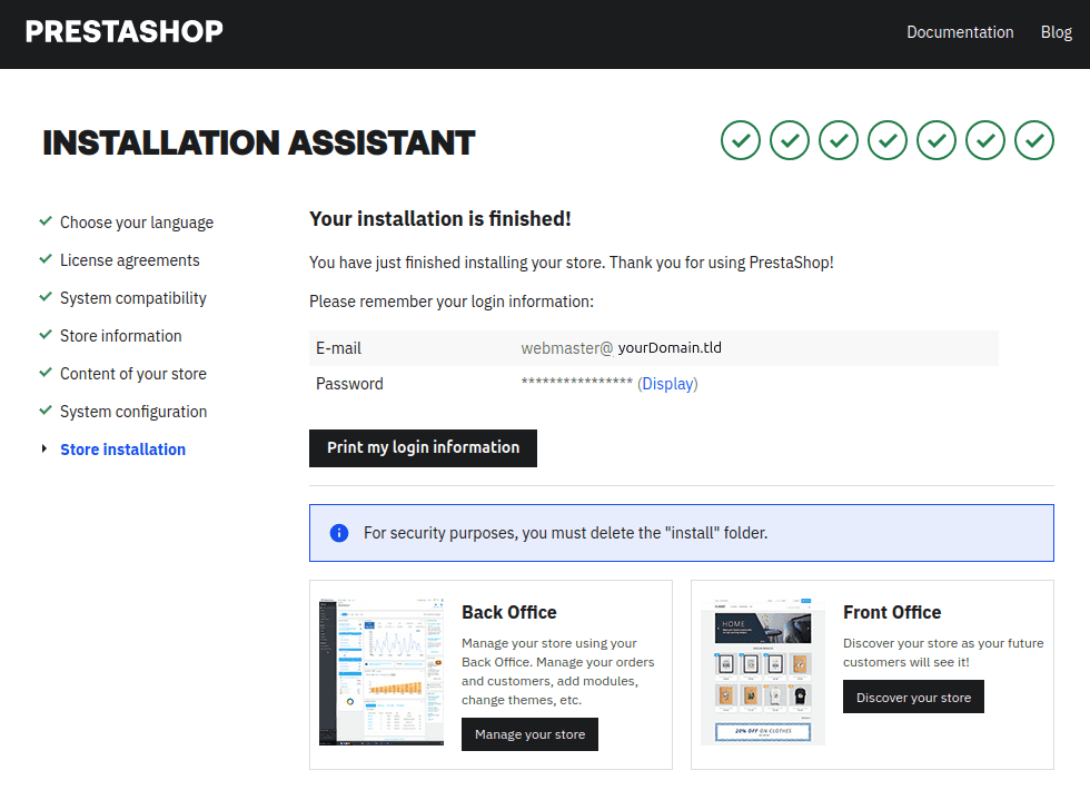You should now be done with the installation and setup of PrestaShop and should be able to log in to the administration interface of your online store.