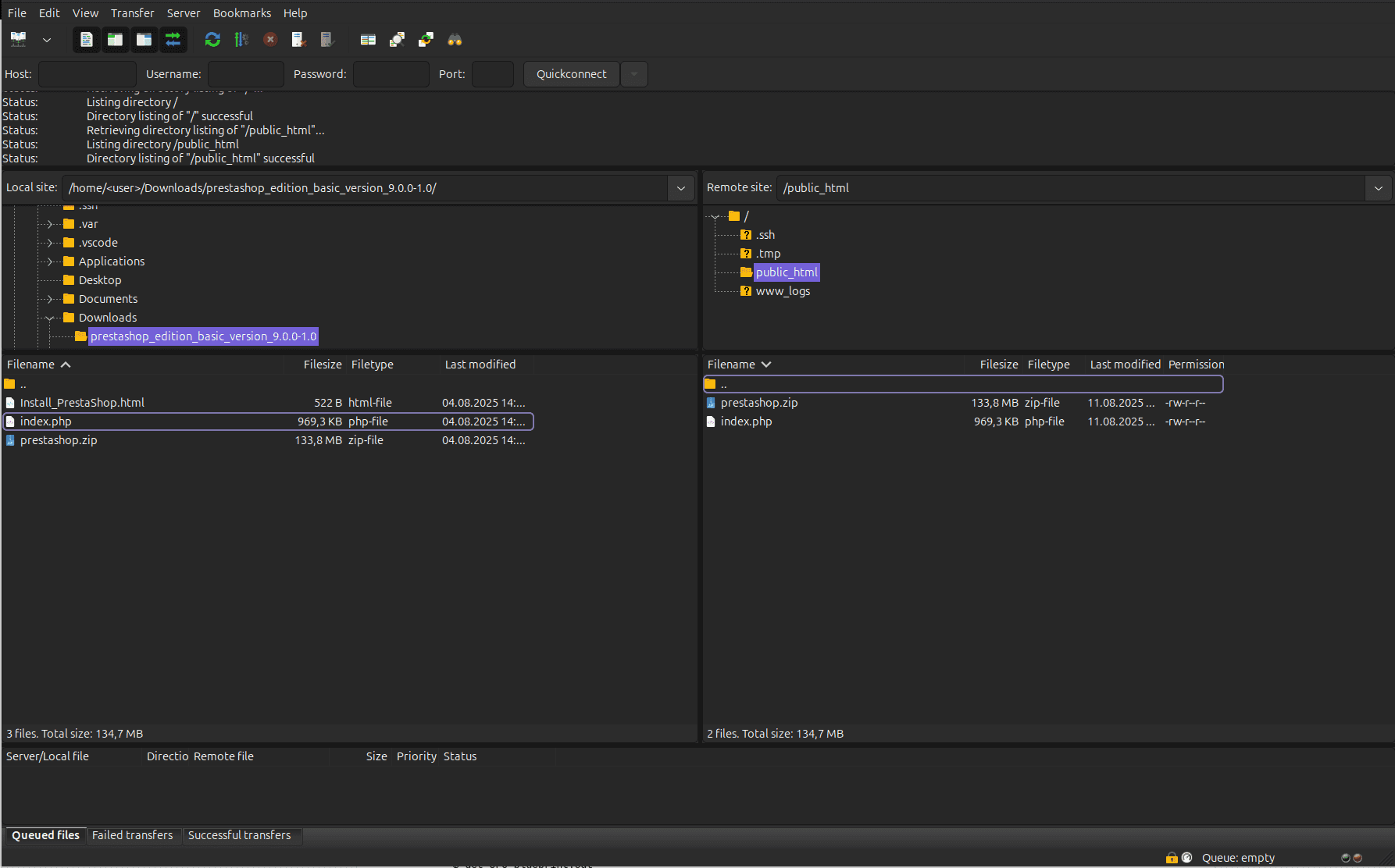 from the left window to the right window and wait until FileZilla has completed the transfer.