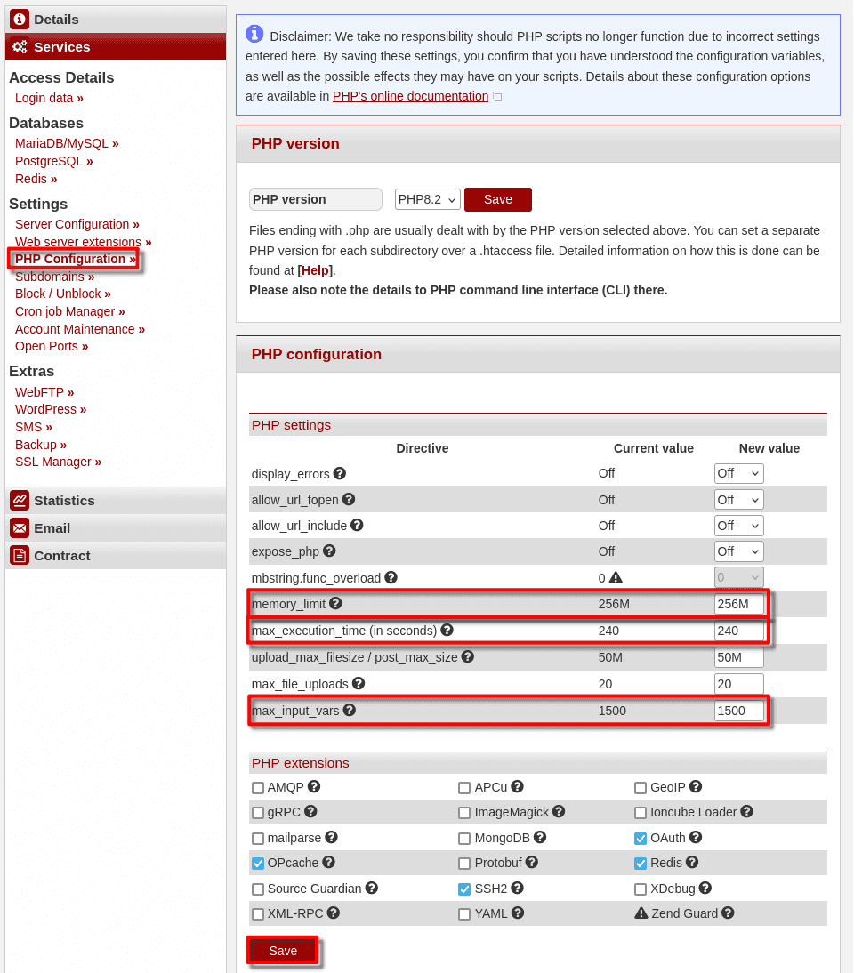 - Scroll down to "PHP settings" and set the folowing values: