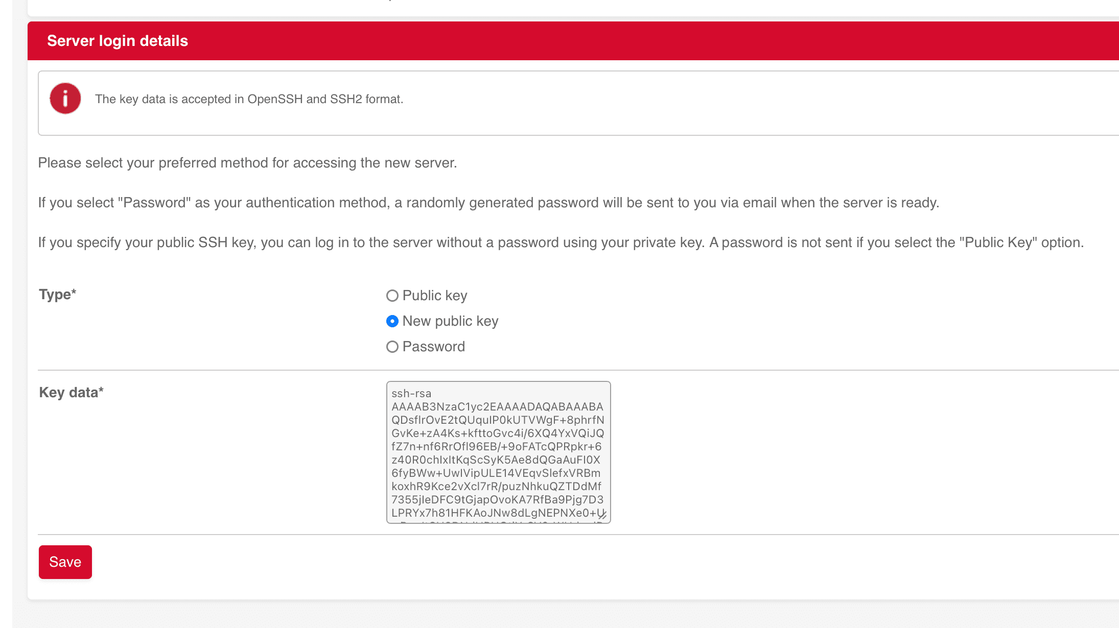Now, go back to the Hetzner Robot Console, select New public key and paste the copied public key into the Key data field. Click the Save button.