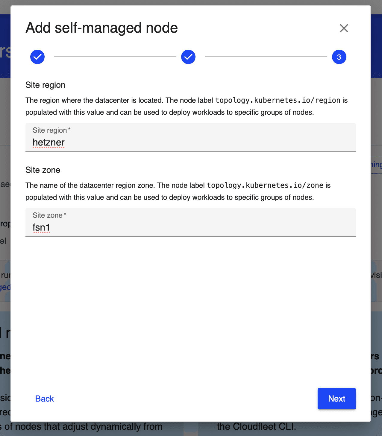 On the third step, please enter "Site region" and "Site zone" values. These are arbitrary values that are going to be used as topology.kubernetes.io/region