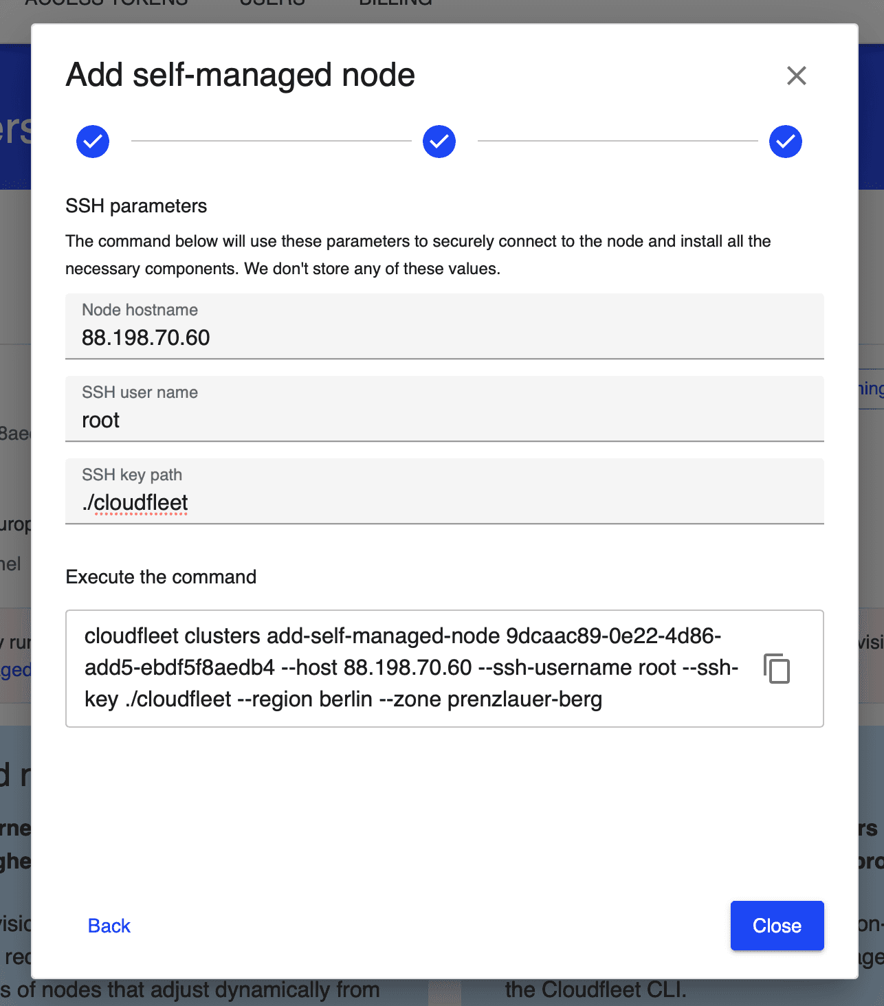 Cloudfleet Console provides an easy way to generate the CLI command needed to add the dedicated server to the cluster. Navigate to the Cloudfleet Console, and on the top right corner of the cluster details page, click on the Add self-managed node button. This will open a dialog to help you to configure your CLI again. Since you already have the Cloudfleet CLI installed and configured, you can skip the first two steps and proceed to the third one.