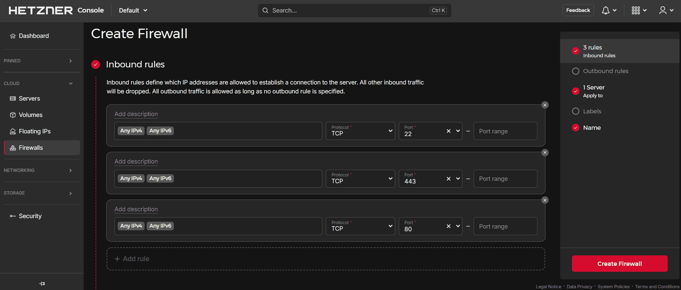 | Can't SSH after firewall configuration | Check that port 22 is included in your firewall rules | Use Hetzner's web console for emergency access |