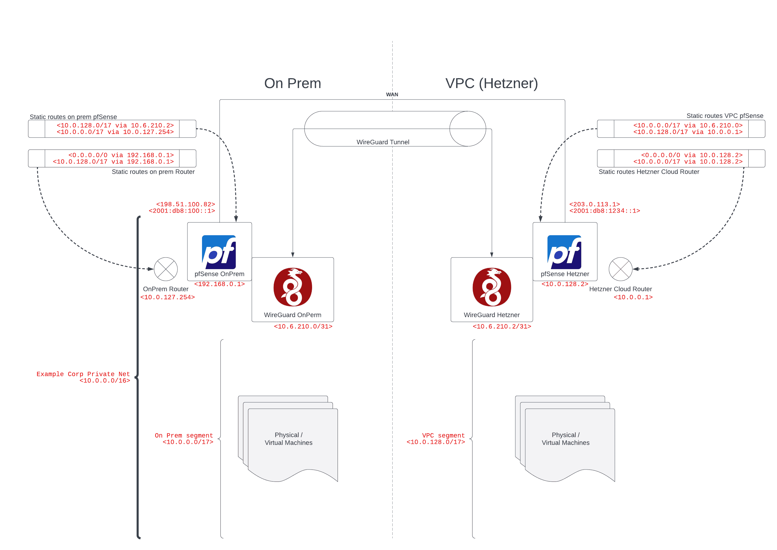You should have a working site-to-site VPN. All clients in these network segments should see each other transparently. Your Hetzner Cloud pfSense instance is acting as the firewall and routes general "internet" traffic for your VPC machines while traffic to your on-prem machines is routed through the WireGuard tunnel.