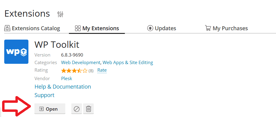 If the indicator says "Open", the extension is already installed. If it says "Get It Free" or "Update", you will have to click on it to trigger the installation of WordPress Toolkit. Then, you can click on "Open".