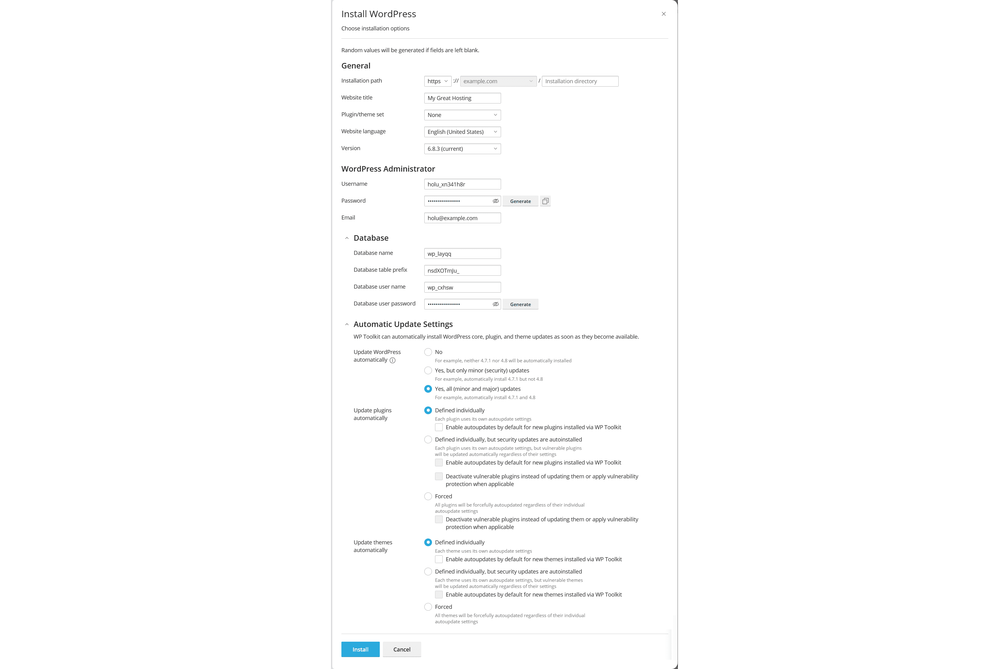On the next page, you don't have to change anything, unless you want to have a specific version, a different language, username, database or auto update-settings. You can also set your website title directly.