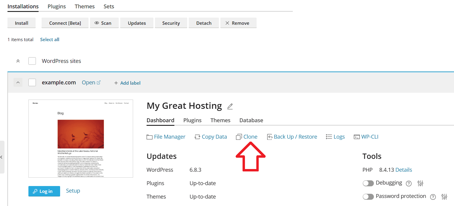 If you want to apply an update of WordPress, install a plugin or a theme, or if you want to change some content, it's best practice to test such changes first. For this, just click on "Clone" in the Dashboard section of the WordPress Toolkit.